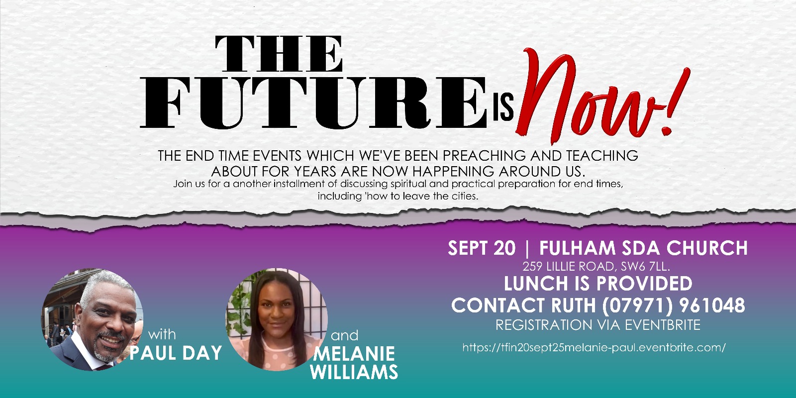 We are very happy once again to have our next 'The Future is Now' event on Sabbath 20th September 2025. The topics are 'Who are You?' by Paul Day, and 'Leaving the Cities' by Melanie Williams.